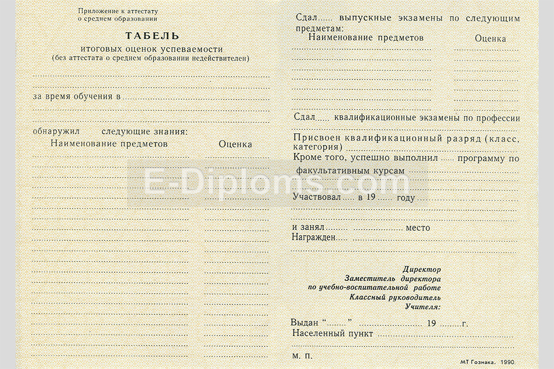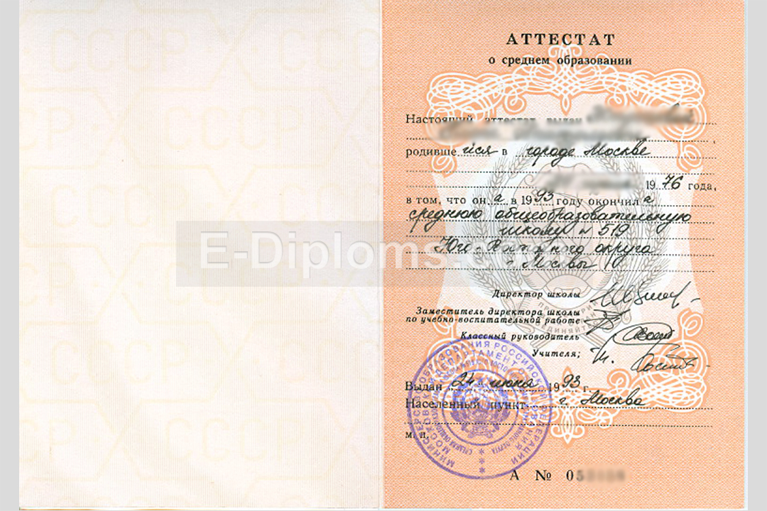 У нас на сайте Вы можете купить аттестат СССР об окончании 10 или 8 классов в период с 1970-х и по 1993 года включительно. Выбирайте любую школу Союзных Республик, в том числе России, Украины, Казахстана, Грузии и прочее, а мы изготовим качественный документ быстро, профессионально, анонимно и в соответствии со всеми стандартами, принятыми во времена СССР. Доставка бесплатна, оплата при получении, для проживающих в регионах доступна услуга «макет», есть скидки. При заказе до 14.00 привезем уже завтра!