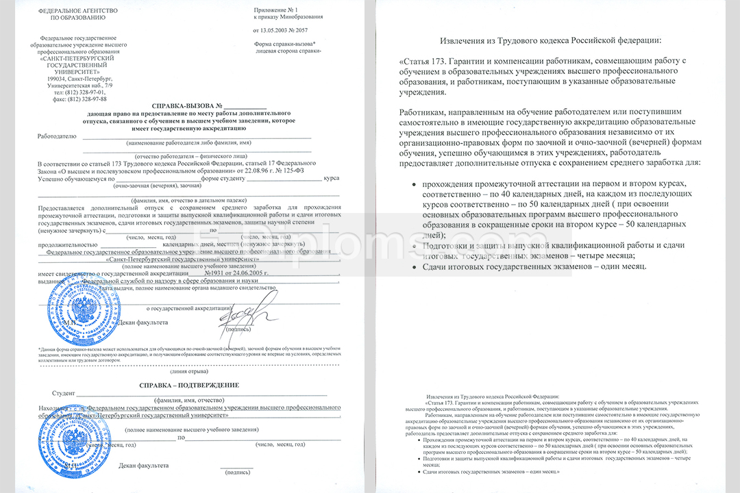 Вы можете купить справку вызов на сессию для работодателя, дающая право получить дополнительный отпуск, связанный с обучением в высшем учебном заведении, имеющем государственную аккредитацию. Отпуск может быть как с сохранением, так и без сохранения заработной платы (см. статью 173 ТК РФ). Заполняем по образцу выбранного ВУЗа и установленным государственным стандартам. Мокрая печать и подписи соответствуют оригиналам. Доставка бесплатна, оплата при получении, для проживающих в регионах доступна услуга «макет», есть скидки. Обращайтесь!